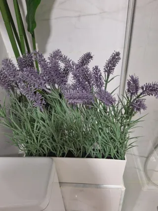 Planta artificial de gran tamaño, ideal para dar un toque verde a tu hogar. Se venden juntas. - Planta de ave del paraíso con hojas verdes. - Base con flores de lavanda artificiales.