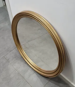 Elegante espejo con marco metálico en acabado dorado. Su forma redonda le da un toque distintivo. - Marco con diseño acanalado. - Ideal para cualquier estancia. - Diámetro de 70cm