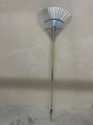 Rastrillo de metal con mango de madera, ideal para recoger hojas y césped. - Mango de madera. - Cabezal metálico en forma de abanico. - Incluye un rastrillo escarificador pequeño para quitar césped muerto y resembrar -posibilidad de cambiar y acoplar diferentes herramientas(sierra,rastrillo...etc)