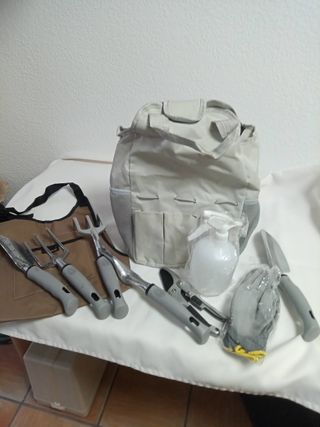 Set de herramientas de jardinería a estrenar, ideal para tus tareas en el jardín. Incluye una práctica mochila para llevar todo organizado. - Set de jardinería completo. - Incluye mochila. - Herramientas de mano.nuevo a estrenar,se compone de mochila,delantal varios tipos de palas y rastrillos,pulverizador y guantes ,sin estrenar