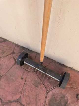 Rastrillo de jardín con ruedas, ideal para airear el césped. Es un utensilio usado, pero en buen estado. - Perfecto para trabajos de jardinería. - Con mango de madera. - Ruedas para facilitar el desplazamiento.