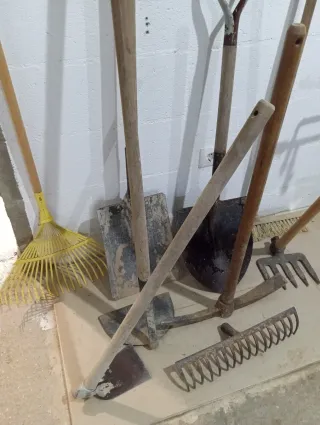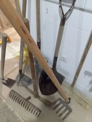Conjunto de herramientas esenciales para el cuidado de tu jardín. Cada herramienta 15€ - Pala de punta 20€ - Tijeras de podar grandes (2 unidades) - Tijeras de podar pequeñas - Rastrillo de mano - Rastrillo de hojas - Mango de madera para herramientas