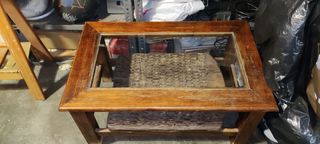 Mesa baja de cristal con una decoración de un rastrillo de trigo, ideal decoración