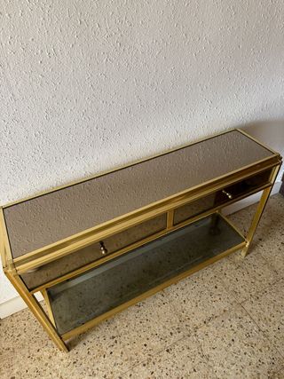 Elegante mueble recibidor de estilo vintage con un diseño sofisticado. - Estructura metálica en tono dorado. - Superficies de cristal con acabado espejo. - Dos cajones con tiradores discretos. - Balda inferior adicional para almacenamiento.