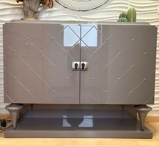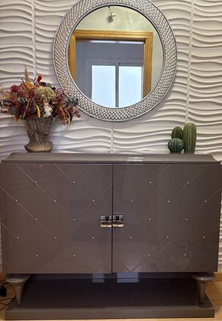 Elegante mueble recibidor con un espejo circular decorado. Ideal para dar un toque de distinción a tu entrada. - Acabado en tono grisáceo. - Marco del espejo con detalles brillantes. - Diseño moderno con puertas frontales. luz por debajo led