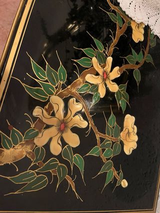 Elegante recibidor de estilo antiguo con un diseño sofisticado. Antiguedad en perfecto estado - Acabado principal en negro con detalles florales lacado - Estructura fabricada con materiales de calidad.