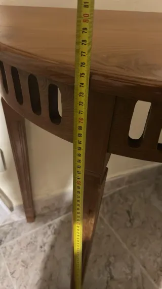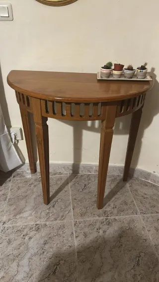 Vendo bonita consola de media luna en madera blanca. Se encuentra en buen estado general, aunque presenta algunas marcas de uso que le dan un toque auténtico.Es un mueble muy práctico para espacios pequeños o pasillos estrechos, ya que tiene poca profundidad y no entorpece el paso. Ideal para usar como recibidor o mueble de apoyo. Medidas del mueble Ancho (largo) 88 cm Fondo 30 cm Alto 80 cm Material: Madera. Color: Blanco. Ubicación: A recoger en mano en Passeig de Gràcia (Barcelona). No dudes en escribirme si quieres venir a verla o si tienes cualquier pregunta.