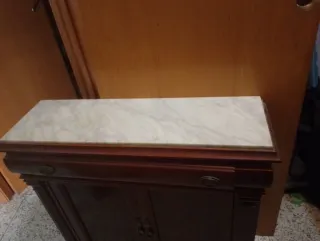Elegante mueble recibidor de estilo antiguo, perfecto para dar un toque clásico a tu hogar. Combina la calidez de la madera con la sofisticación del mármol. - Diseño con dos puertas y dos cajones. - Acabado en madera oscura. - Encimera de mármol. Recoguida cerca de plaza españa. Edificio con ascensor. Pregunta si tienes alguna duda