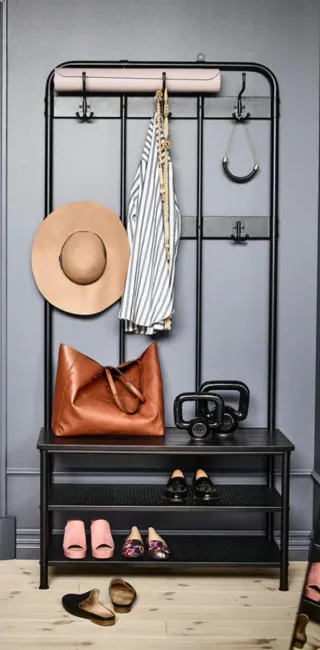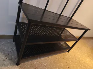 Conjunto de perchero y zapatero de Ikea, ideal para organizar tu recibidor. - Estructura metálica. - Acabado en color negro. - Incluye baldas para zapatos y ganchos para colgar.