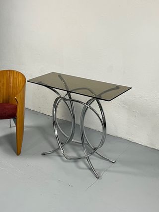 Elegante mesa auxiliar o de recibidor tubular de los años 70. Diseño original con estructura tubular cromada formando aros entrelazados, muy representativo del estilo setentero. Sobre de cristal fumé en tono ahumado. Pieza decorativa y funcional, ideal como mesa auxiliar, de apoyo o para recibidor. Buen estado general. tags: mesita table vintage retro años 60 70 80 design disseny kartell cesca danes escandinavo miguel mila santa cole enetri ikea wassily guzzini artemide togo alquiler atrezzo Cassina Knoll Thonet Vitra Pilma Vinçon Habitat Stua Kave home Punt mobles 114 Montse Minot