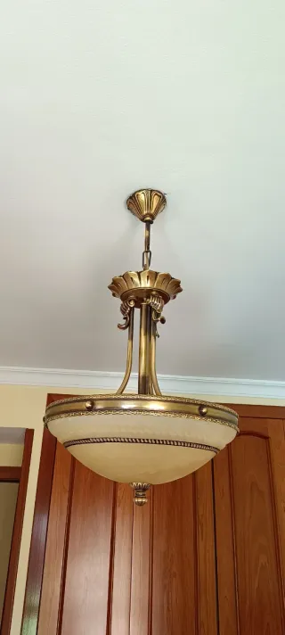 Elegante lámpara de techo con un diseño clásico,sofisticado y de gran calidad. (No Ikea) Fabricada en metal y tulipa de vidrio, no es el típico modelo actual. Ideal para salón, recibidor o vivienda con estilo clásico. Combina a la perfección con diversos estilos de decoración. - Acabado metálico en tono dorado. - Pantalla de cristal en color beige. - Detalles ornamentales en la estructura. Está como nueva, funcionando perfectamente. 📍 Entrega en mano en Málaga capital. Precio negociable con seriedad. No hago envíos por su tamaño.