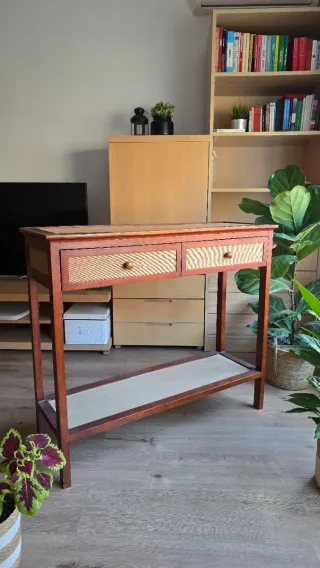 💱 PRECIO NEGOCIABLE 💱 Vendo mueble de entrada o recibidor de madera real en buen estado. Tiene dos cajones funcionales y balda inferior para almacenaje extra (cestas, decoración, etc.). 👉 Ideal para hall, pasillo o como mueble auxiliar. 👉 Estilo cálido y atemporal, combina con decoración nórdica, rústica o clásica. Medidas: Largo: 101 cm Fondo: 35 cm Alto: 87,5 cm El mueble está estructuralmente perfecto. Tiene pequeñas marcas de uso en la parte superior (ver fotos), normales por el paso del tiempo, que no afectan a su funcionalidad. Incluye dos cristales protectores para las dos superficies. Ideal para restauración y DIY.