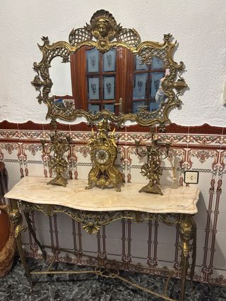 Conjunto de recibidor con espejo, reloj y candelabros. - Mesa de consola con sobre de mármol, la piedra esta partida - Estructura de forja con detalles ornamentales. - Espejo con marco de forja. - Reloj de sobremesa de forja. - Dos candelabros de forja.