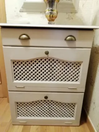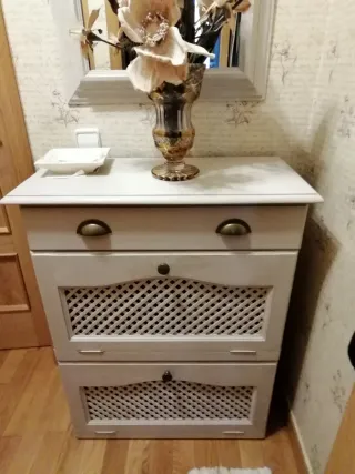 Mueble auxiliar de madera, ideal para recibidor o como zapatero. Su diseño combina funcionalidad y estilo. -Medidas 96cm. alto, 75 cm ancho, fondo 33c. -Cajón alto 13cm. Zapateros 34cm. celosia. para ventilación. -12 pares de calzado. -Tiradores dorados. - Acabado en color marfil. - Dos puertas con celosía. - Un cajón superior.