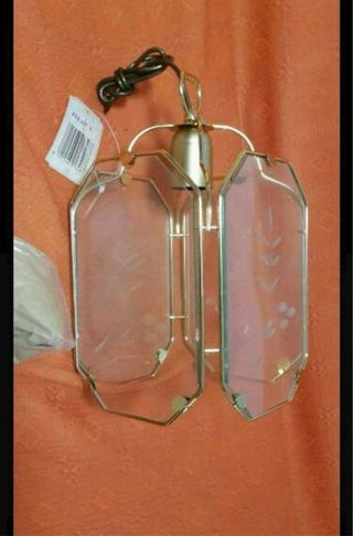 Elegante lámpara de techo colgante con un diseño moderno. - Estructura metálica dorada. - Paneles de cristal transparente con detalles grabados. - Colgante con cadena para ajustar la altura.