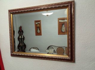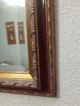 Elegante espejo con un marco que combina tonos madera y dorado, aportando un toque de distinción a cualquier espacio. - Marco con detalles ornamentales. - Diseño rectangular.
