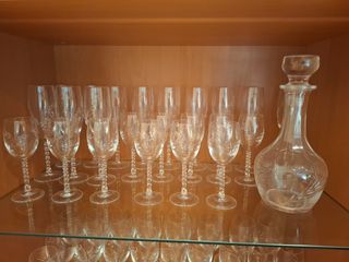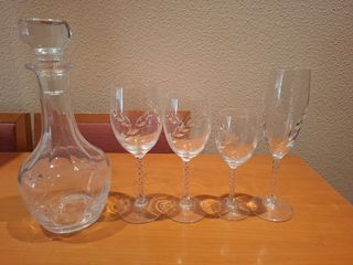 Elegante juego de copas de cristal con un diseño tallado. - Incluye una jarra y cuatro copas. - Diseño de espiga en el cristal. - Base y tallo torneados. Falta una copita de las del tamaño mediano de las que hay, todo lo demás es nuevo sin usar. Tiene 45 años de antigüedad y está en perfectas condiciones.