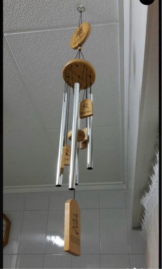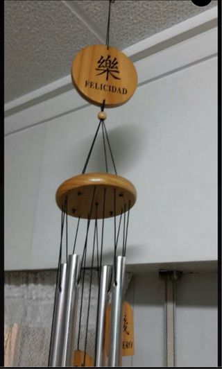 Este atrapasueños combina elementos de madera y metal, con un diseño colgante. - Pieza decorativa con tubos metálicos. - Adornos de madera con inscripciones. - Colgante central de madera.