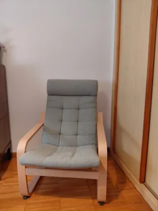 Silla y taburete Poang de Ikea. Cómodos y resistentes, con un par de pequeñas marcas en la tela (como se ve en las fotos). Las fundas de tela se lavaron ayer, así que están limpias y frescas. De un hogar libre de humo. Tenemos gatos y un perro, así que tenlo en cuenta si eres sensible al pelo de las mascotas (aunque las fundas se acaban de lavar). Ideal como sillón de lectura, como complemento para el salón o como sillón de relax en la oficina.