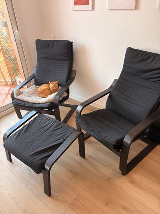 Conjunto de dos sillones y un reposapiés modelo Poäng de Ikea. Buen estado. El conjunto por 110€, un sillón por 45€, un sillón con reposapiés por 65€. El gato y la manta no están a la venta 😂 - Dos sillones. - Un reposapiés. - Estructura de madera. - Cojines de tela.