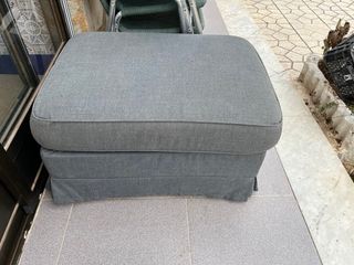 Reposapiés de IKEA que ofrece espacio de almacenamiento adicional. En buen estado y con poco uso. Solo recogida en ubicación. Es posible venderlo junto al sofá de la fotografía por 185€ más. - Tapizado en tela. - Color gris.