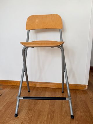 Taburete alto plegable de IKEA, ideal para espacios reducidos. Su diseño permite guardarlo fácilmente. - Asiento y respaldo de madera. - Estructura metálica resistente. - Reposapiés integrado.