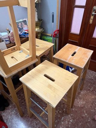 Taburete alto de madera, perfecto para una barra o mesa alta. - Diseño sencillo y funcional. - Con asa para facilitar su transporte. - Reposapiés metálico. -tiene pequeñas marcas en el asiento