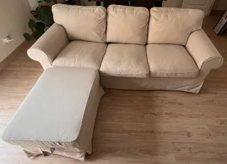 Sofá de tres plazas EKTORP de IKEA. Un mueble cómodo y espacioso para tu salón. El reposapiés se vende aparte. - Funda de tela. - Color beige. Está en perfectas condiciones, ni una sola mancha.