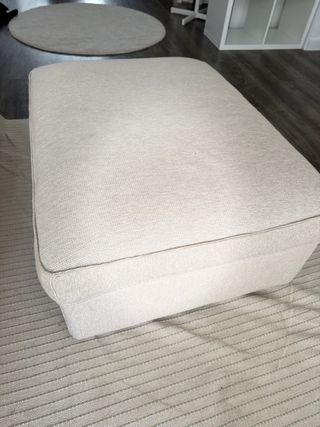 Puff reposapiés de la serie KIVIK de IKEA, con compartimento de almacenaje (storage). Muy práctico como reposapiés, asiento extra o para guardar cojines, mantas, etc. • Color: beige-gris (Tibbleby / tonalidad similar) • Medidas: 90 cm de ancho x 70 cm de profundidad x 43 cm de alto.  • Tapizado troquelable y lavable según instrucciones de IKEA • Estado: como nuevo