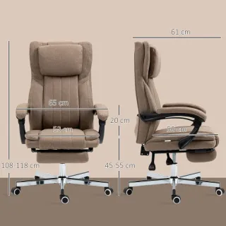 Silla de oficina ergonómica y reclinable con acolchado de espuma de alta densidad. Altura ajustable (47-55cm) e inclinación mediante palanca neumática certificada TUV para estabilidad. Reposacabezas, reposabrazos acolchados y reposapiés extraíble para el máximo confort. Giratoria a 360° con 5 ruedas para una movilidad fluida. Dimensiones: 66L x 76P x 112-120Acm, capacidad de peso 120kg. Cubierta de lino duradera. Diseño moderno y práctico, ideal para largas horas de trabajo. Lleva la comodidad a tu oficina con Vinsetto, para una experiencia de trabajo óptima.