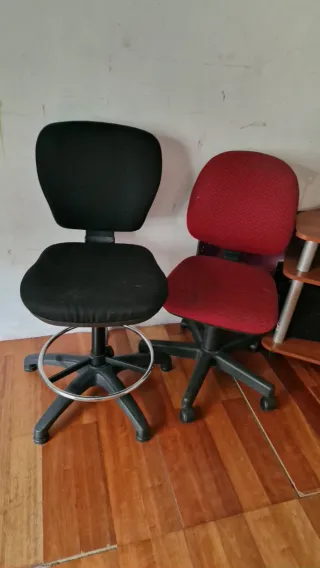 50 euros por todo el Conjunto de muebles de oficina, ideal para equipar tu espacio de trabajo. - Dos sillas de oficina con asiento y respaldo. - Una silla de oficina con asiento, respaldo y reposapiés. - Una mesita auxiliar con dos cajones. - Un mueble estantería con dos baldas.