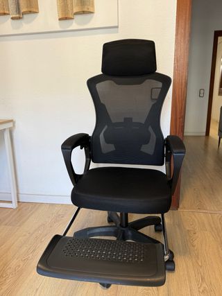Vendo silla ergonómica de oficina, en buen estado general. Características: • Respaldo de malla transpirable • Reposacabezas regulable en altura e inclinación • Respaldo reclinable • Reposapiés extensible (se guarda debajo del asiento) • Altura ajustable • Base con ruedasp Estado: • Usada • Los apoyabrazos están algo pelados, tal como se ve en la foto • Por el uso, la estructura está ligeramente holgada (los tornillos han cedido un poco con el tiempo). Sigue siendo segura y estable para sentarse, pero se nota ese desgaste normal • Todas las funciones funcionan correctamente