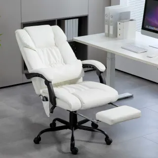Silla de oficina ergonómica en color blanco, diseñada para ofrecer comodidad durante largas jornadas. Cuenta con un reposapiés extraíble y un sistema de masaje. - Reposapiés retráctil. - Función de masaje de 6 puntos. - Diseño acolchado para mayor confort.