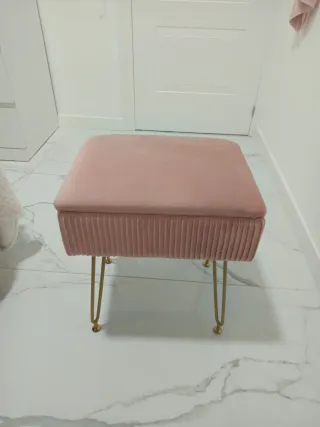 Elegante reposapiés con un diseño moderno y funcional. - Tapizado en suave terciopelo. - Patas metálicas doradas. - Incorpora un práctico cajón de almacenamiento. -Completamente nuevo sin ninguna marca ni tara.