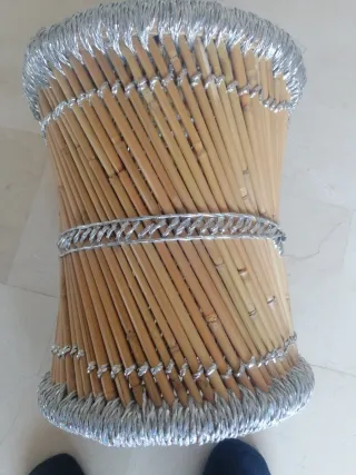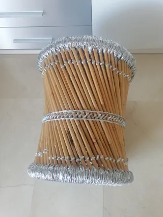 Tiene una estructura de madera y un asiento tejido con cuerdas de colores, hechas de algodón, nylon y material reciclado. Mueble de utilización como asiento auxiliar, pieza decorativa o reposapiés.