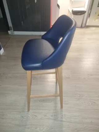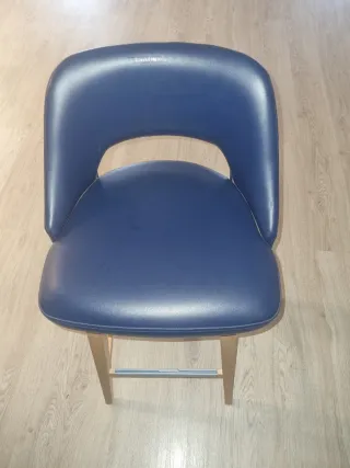 Taburete con asiento tapizado en cuero azul marino y estructura de madera. - Diseño moderno y elegante. - Reposapiés metálico. - Patas de madera resistentes.