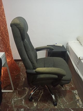 Silla de escritorio giratoria, reclinable y de altura variables. El material de la silla es tela, las ruedas de plástico y la base metálica. Tiene un reposapiés para cuando se inclina totalmente. Necesita algo de restauración, sobre todo retapizado y ajuste del sistema de reclinación. Dimensiones: Altura 115-125 cm. Ancho 70*70 cm.