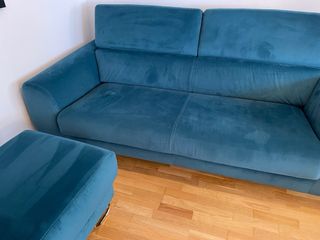 Sofá moderno con reposapiés a juego de 3 plazas en perfecto estado, acompañado de un módulo reposapiés a juego. Tapizado en un precioso verde h con textura aterciopelada muy suave al tacto, con patas metalicas doradas. Muy cómodo, con respaldo alto y reposabrazos amplios.