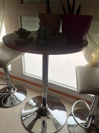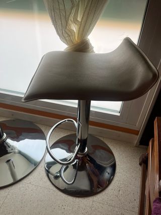 Conjunto de dos sillas altas con diseño moderno y funcional. - Asiento y respaldo acolchados para mayor comodidad. - Base redonda y estable con reposapiés. - Altura regulable mediante palanca.