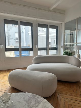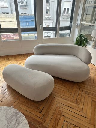 Conjunto de sofá y reposapiés. Se ha usado siempre con funda. No tienen ni una mancha. Esta nuevo. - Diseño curvilíneo y orgánico. - Reposapiés a juego. - Reposabrazos izquierdo.