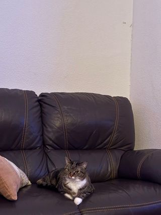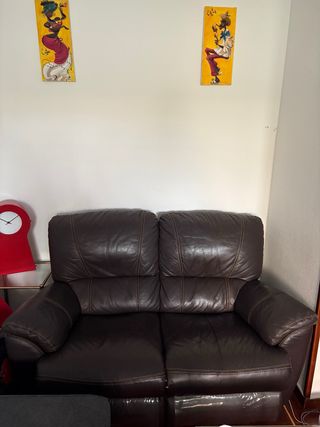 Sofá de dos plazas con reposapiés. Muy cómodo. - Tapicería de piel. - Color marrón. Los desperfectos que tiene son los de la foto. Se escuchan ofertas. Disponible para recoger del 1 al 5 de abril.