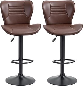 Conjunto de 2 taburetes de bar en piel sintética con respaldo, ideales para casa y bar. Dimensiones: 42L x 45P x 89-110Acm, asiento giratorio a 360°. Altura ajustable de 89cm a 110cm, con reposapiés para un confort óptimo. Estructura de acero de calidad con base Ø38cm para estabilidad y patas antideslizantes para proteger el suelo. Capacidad de peso: 120kg. Tapizado en similpiel PU y espuma para un asiento suave. Montaje requerido. Diseño elegante con costuras cuadradas, perfectos para cualquier ambiente. ¡No te los dejes escapar!