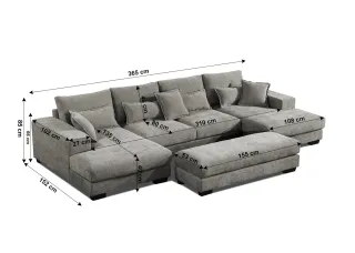 Sofá modular de gran tamaño, perfecto para salones amplios. Sus dimensiones totales son 365 cm de largo. - Profundidad del chaise longue: 152 cm. - Altura del asiento: 40 cm. - Profundidad del asiento: 80 cm. - Altura del respaldo: 85 cm. - Ancho del brazo: 102 cm. - Profundidad del reposapiés: 53 cm. - Largo del reposapiés: 155 cm. - Ancho de la sección más corta: 108 cm. - Profundidad de la sección más corta: 310 cm. - Altura del cojín: 46 cm. - Ancho del cojín: 27 cm. - Largo del cojín: 135 cm.