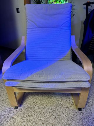 Comodísima butaca de Ikea modelo POÄNG con su reposapiés a juego (243 euros en tienda). El diseño curvo de la estructura de madera aporta flexibilidad y confort. - Estructura de madera curvada. - Cojines de tela en color beige desenfundables para lavado. - Color acacia muy elegante que ya no se vende en ikea. - Se vende por cambio de uso de la habitación.