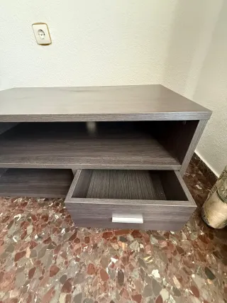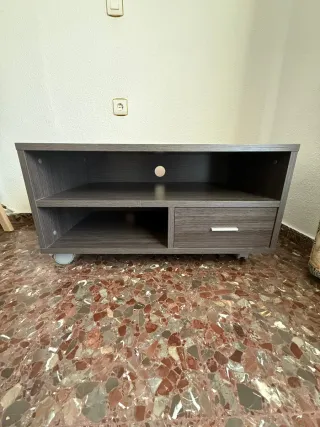 Mueble de televisión con un diseño moderno y práctico. - Acabado en tonos marrones y grises. - Incluye ruedas para facilitar su movilidad. - Dispone de un cajón con tirador. - Medidas: 90 largo x 48,5 alto x 50 profundo
