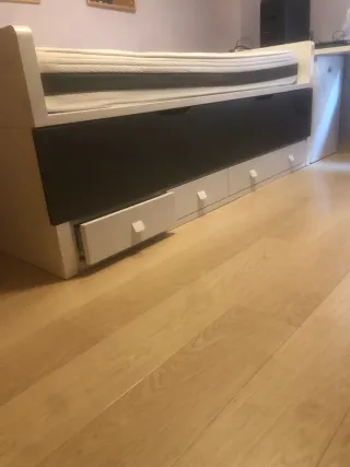 Cama nido con un diseño moderno y funcional. - Estructura principal en color blanco. - Cajón inferior en color gris. - Fabricada con materiales resistentes.