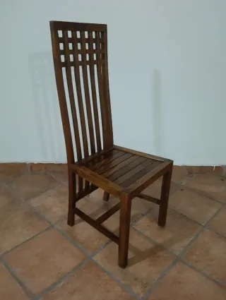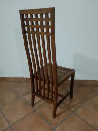 Conjunto de seis sillas de comedor de madera de teka. Su diseño elegante aportará un toque de distinción a tu hogar. - Fabricadas en madera de teka. - Diseño de respaldo con listones y detalle cuadriculado. - Asiento con listones horizontales.
