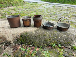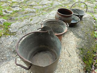 Conjunto de piezas de cobre antiguas, incluyendo una regadera y varios cubremacetas. - Diseño martillado. - Asa en la regadera y cubremacetas. - Ideal para decoración. Regaderas 25€ Cubo grande 20€ Mediano 15€ Pequeño 10€ Cubo con aro 15€ Conjunto por 90€