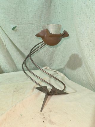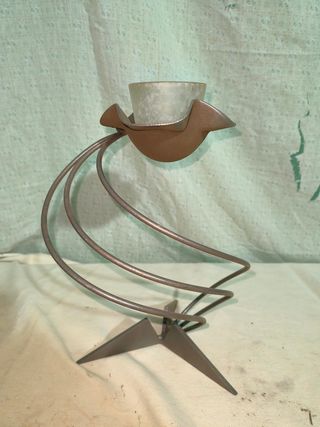 Elegante porta velas con un diseño único. - Base de metal con forma de estrella. - Soporte curvo de metal. - Vaso de cristal translúcido.
