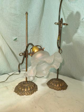 Conjunto de dos lámparas de estilo vintage con brazos articulados. - Base y estructura en tono dorado. - Pantallas de cristal translúcido con forma de volante. - Brazos que permiten ajustar la posición de la luz.